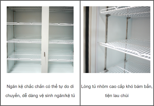 - Tủ mát được trang bị 4 bánh xe, 2 bánh trước có khóa chắc chắn