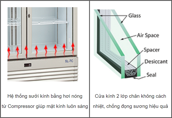 - Cửa kính tự đóng, 2 cánh mở ngang làm bằng cánh kính 2 lớp chống đọng sương